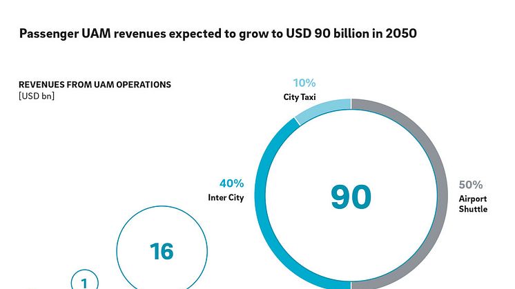 Munich, November 2020: In the coming years, air taxis will supplement private transport in urban areas. The first cities are already testing and planning this future: Demo flights have been conducted in Guangzhou, China, since 2018; the first aircraft are scheduled to transport people around the Olympic games in Paris, France, in 2024; and test flights are soon to be performed in Dallas, USA. The segment of manned Urban Air Mobility (UAM), or the expansion of urban transport systems into the airspace, is expected to reach an annual market potential of USD 90 billion by 2050. This is shown by Roland Berger in their latest study "Urban Air Mobility - USD 90 billion of potential: How to capture a share of the air taxi market”.